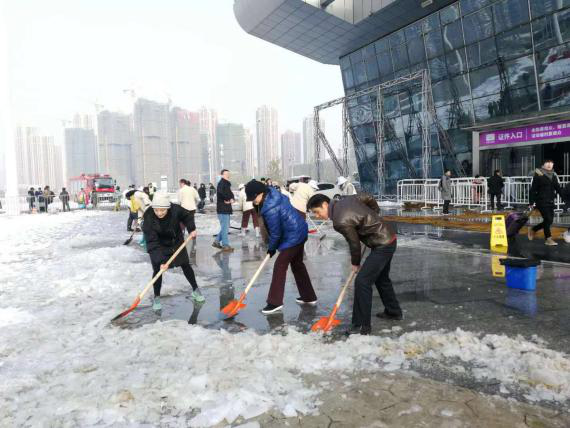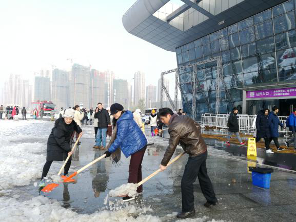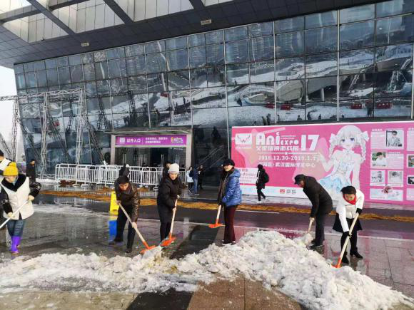 為了現(xiàn)場的人員安全,2018年12月31日清早,漢陽區(qū)會展和物流中心主任李明紅、副主任牛海彤等領(lǐng)導(dǎo)帶頭在武漢國際博覽中心開展了鏟雪除冰活動(dòng),清除展館B0登錄廳外路面積雪,消除安全隱患。大家拿著準(zhǔn)備好的鐵锨、推車、大掃帚等工具,在零下的溫度,冒著刺骨的寒風(fēng),干勁十足地?fù)]動(dòng)手中的鐵鍬和掃帚,一起鑿冰、鏟雪、掃雪,場面熱火朝天。區(qū)會展辦率先垂范,齊心協(xié)力,大家花了近一個(gè)半小時(shí)時(shí)間,清掃出展館外各主要路段的積雪。通過鏟積雪、鋪草墊、排隱患、送溫暖等舉措,確保第十七屆艾妮動(dòng)漫游戲展開展期間秩序穩(wěn)定,來現(xiàn)場參與活動(dòng)的人員基本未受影響。